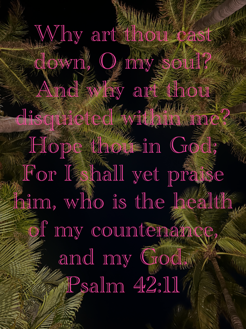 But he didn’t stop there and wallow in that place of depression. This is the part that really encouraged me a few mornings ago!!! He got himself back to where he needs to be in a spiritual sense. He says, “Hope thou in God; For I shall yet praise him, who is the health of my countenance, and my God.”